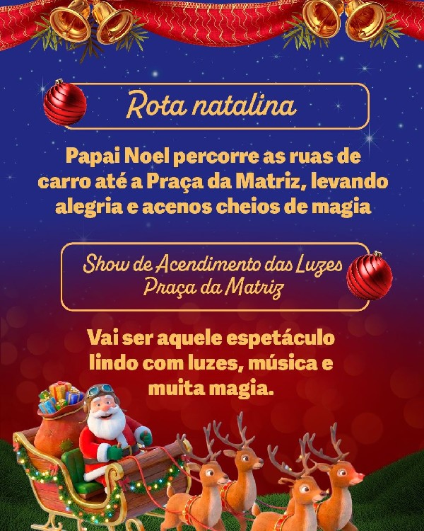 Logo após, a cidade se encherá de cor e alegria com a rota natalina, que seguirá em direção à Casa do Papai Noel, na Avenida das Pizzarias, um espaço criado para aproximar nossa gente da magia desta época.