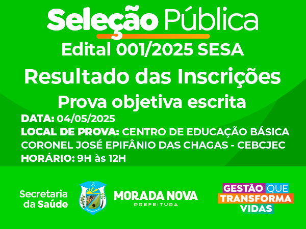 Há 82 diasCHAMAMENTO PÚBLICO PARA MAPEAMENTO DAS ORGANIZAÇÕES DA SOCIEDADE CIVIL - OSC DE MORADA NOVA-CE