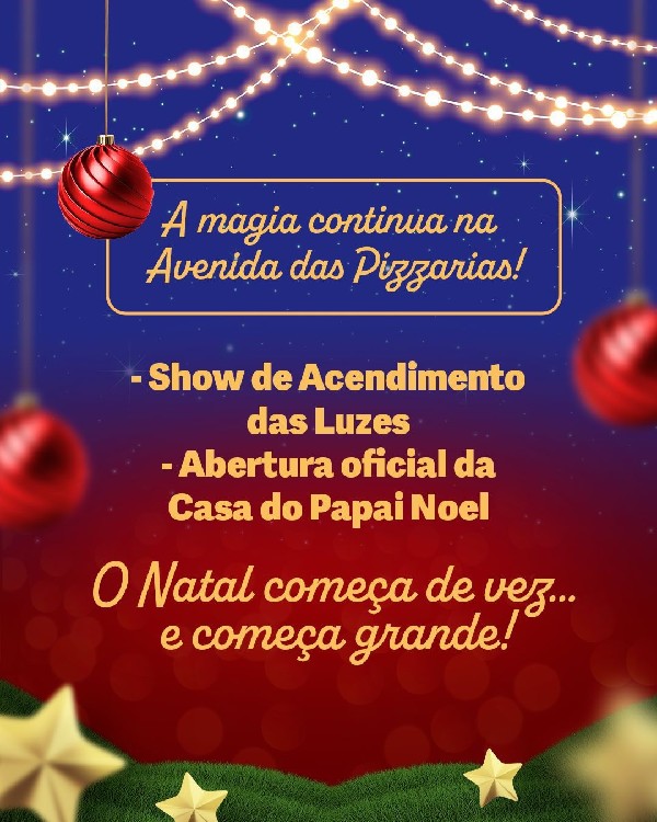 Logo após, a cidade se encherá de cor e alegria com a rota natalina, que seguirá em direção à Casa do Papai Noel, na Avenida das Pizzarias, um espaço criado para aproximar nossa gente da magia desta época.